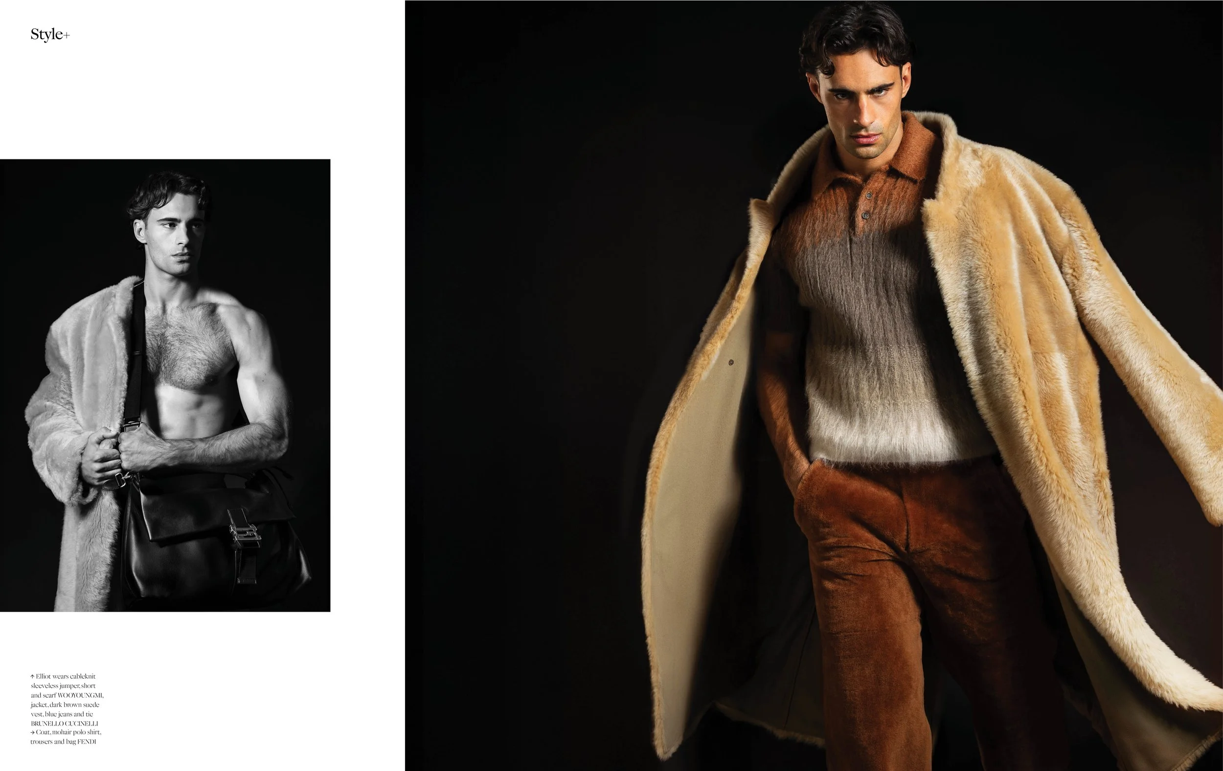 1-4. Elliot Meeten wears jacket WOOYOUNGMI, shirt, trousers and black boots MM6 MAISON MARGIELA 5-6. Gray jumper FENDI, hat, coat, suit, briefs and HUGO BOSS 7-8. Elliot wears zip-up jumper DIESEL, swim briefs ALBARELLA 9-10. Elliot wears red glossy satin jacket and trousers SOLID HOMME, black jacket, trousers and gloves MM6 MAISON MARGIELLA 11-12. Cableknit sleeveless jumper, short and scarf WOOYOUNGMI, jacket, suede vest, jeans and tie BRUNELLO CUCINELLI 13-14. Elliot wears coat, trousers and bag FENDI 15-16. Elliot wears blue jeans BRUNELLO CUCINELLI, leather shirt, pants, bracelet and “Icon” logo briefs DSQUARED2 17-18. Lace shirt FENDI, ring ANNABEL B, gray jumper, lace shirt, trousers and black boots FENDI