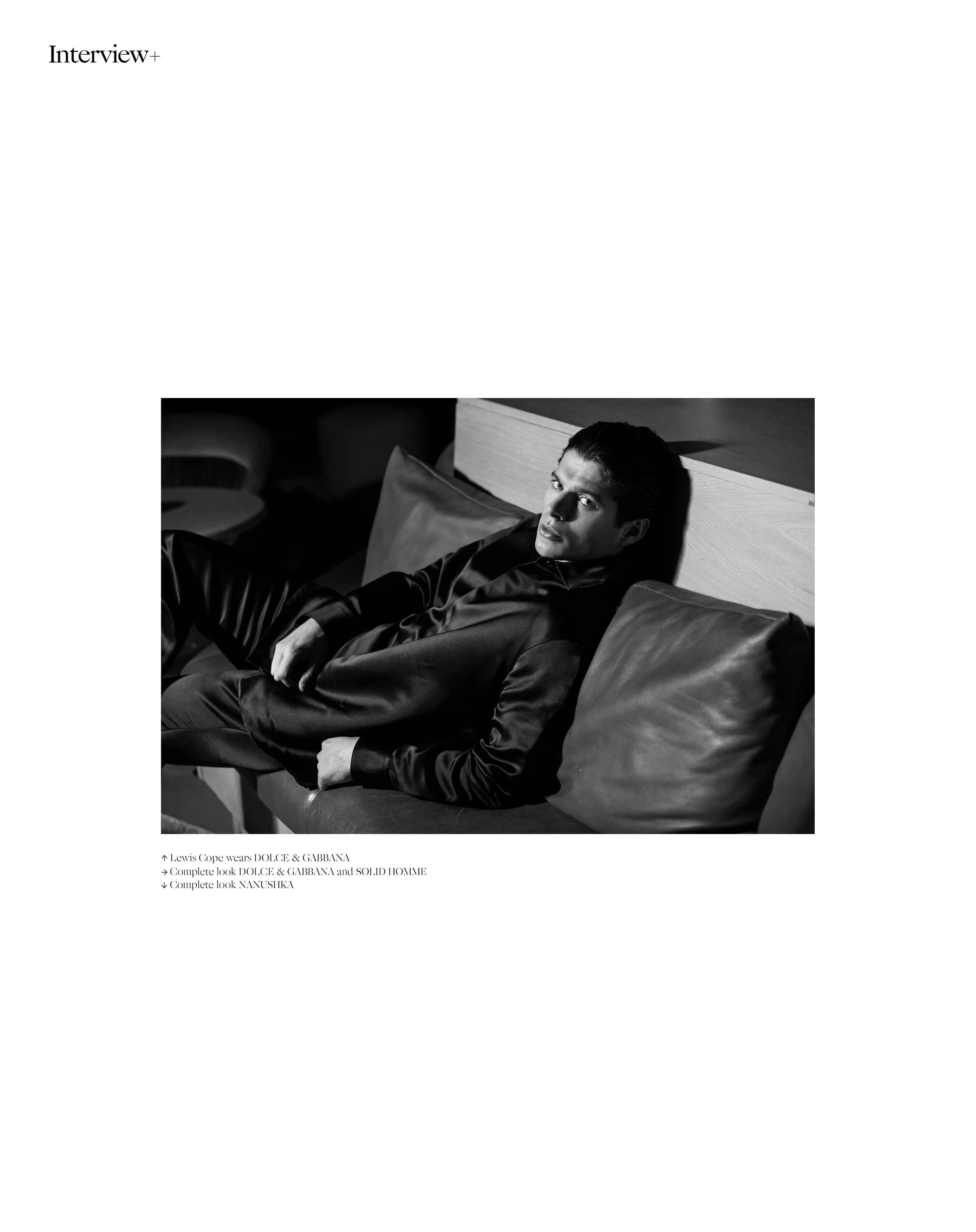 1-6. Lewis Cope wears DOLCE & GABBANA, Complete look DOLCE & GABBANA and SOLID HOMME, Complete look NANUSHKA 7-14. Lewis Cope wears DOLCE & GABBANA and MOSS, Complete look DOLCE & GABBANA, Blue jeans GANT 15-18. Lewis wears NANUSHKA, white briefs SKIMS, Complete look DOLCE & GABBANA
