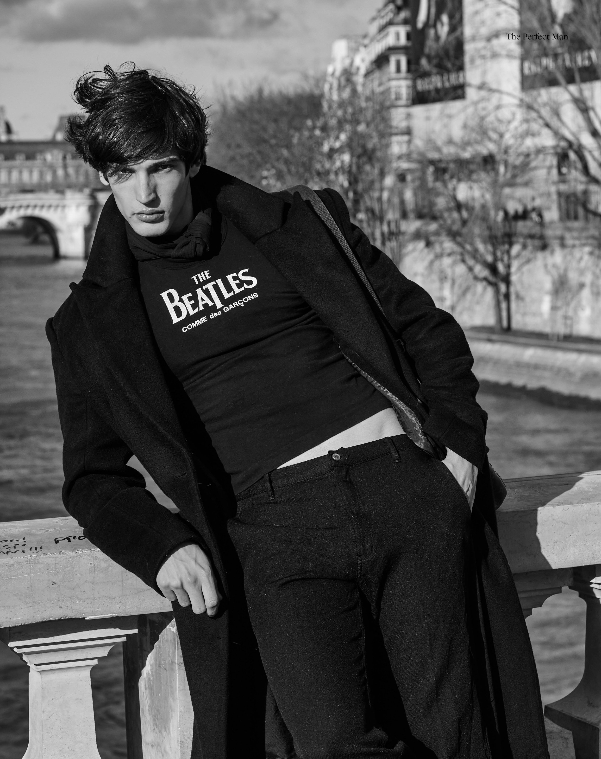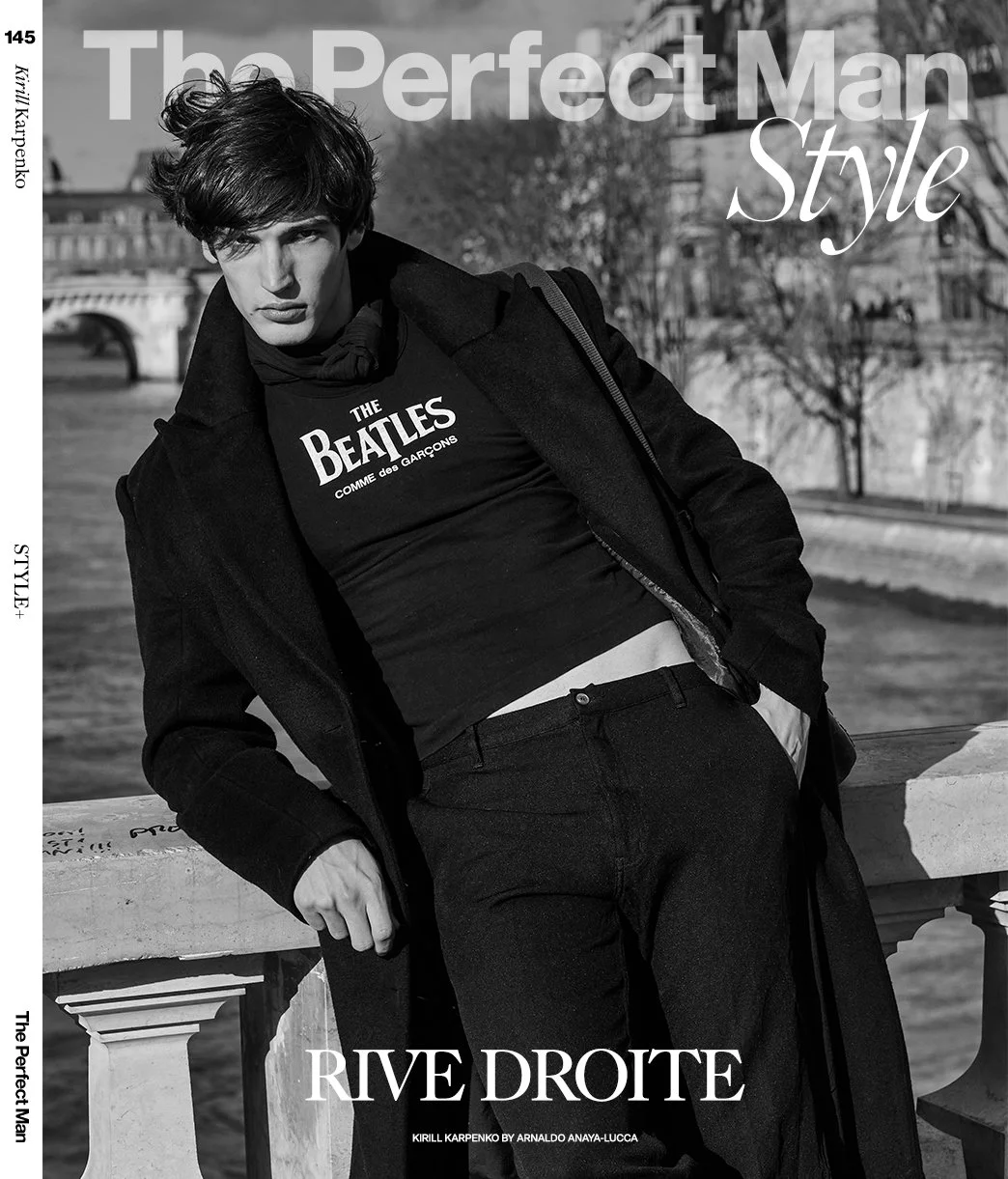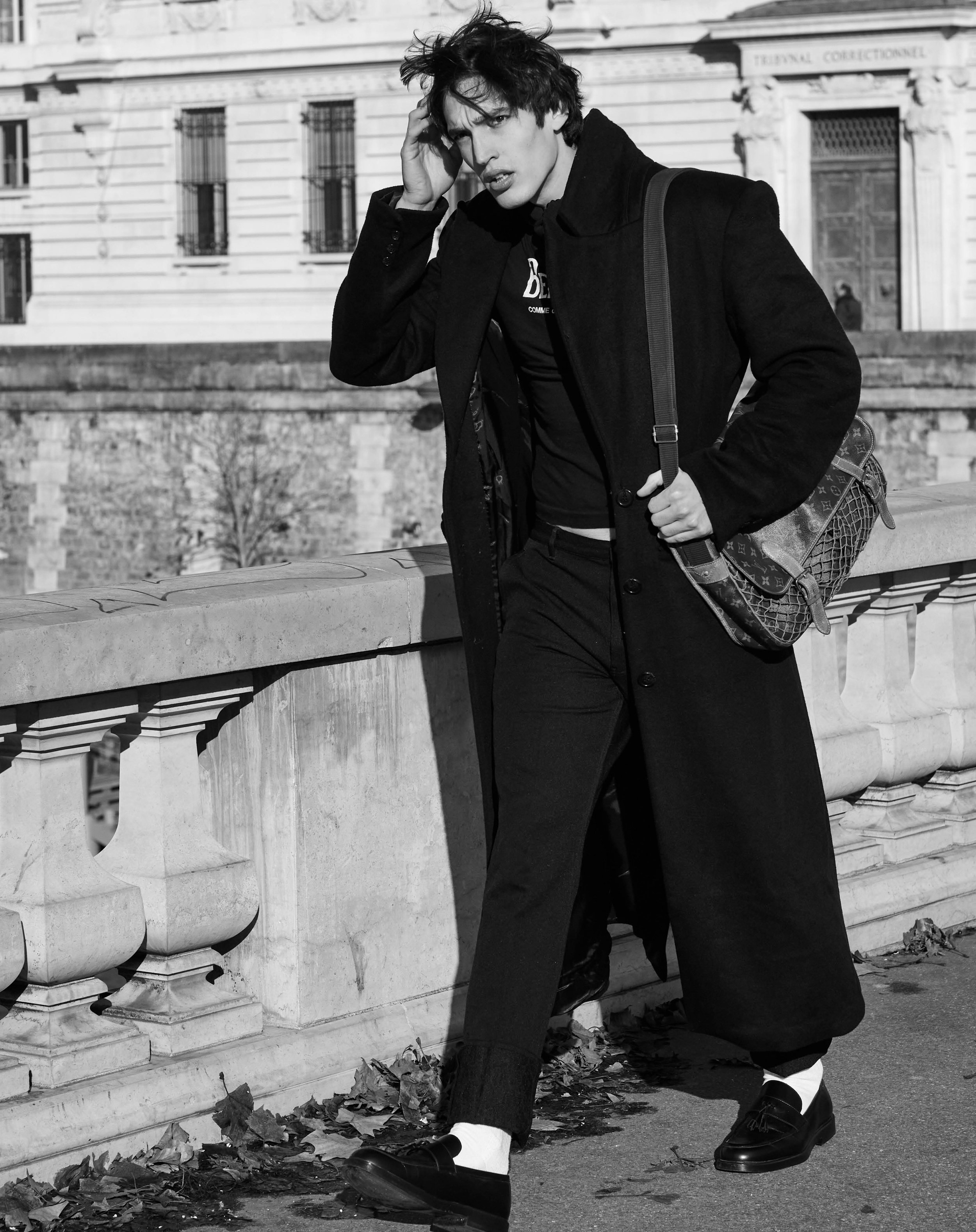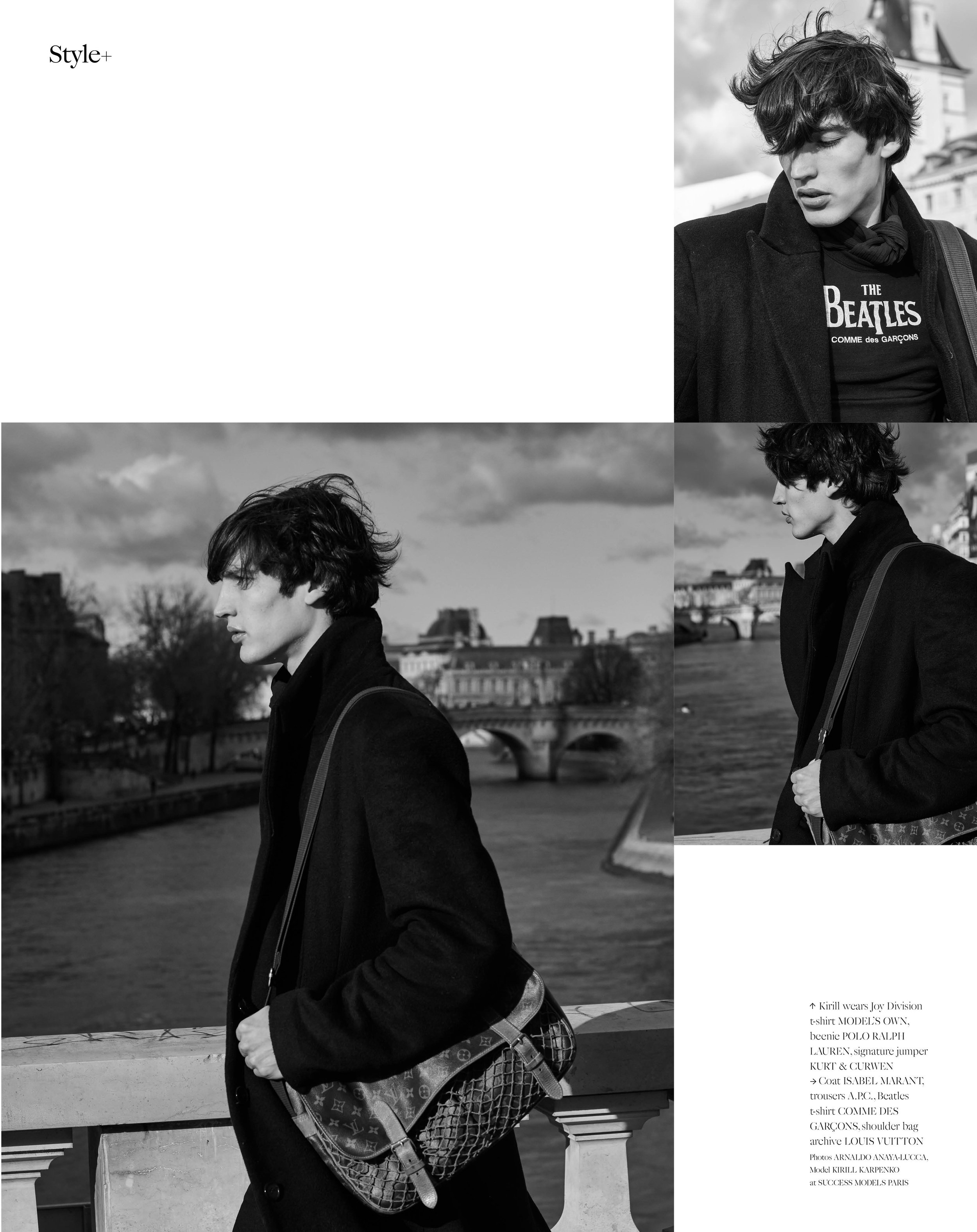 1-4. Kirill Karpenko wears coat ISABEL MARANT, trousers A.P.C., t-shirt COMME DES GARÇONS, bag LOUIS VUITTON 5-10. Kirill wears Joy Division t-shirt MODEL’S OWN, beenie POLO RALPH LAUREN, signature jumper KURT & CURWEN, Coat ISABEL MARANT, trousers A.P.C., Beatles t-shirt COMME DES GARÇONS, shoulder bag archive LOUIS VUITTON