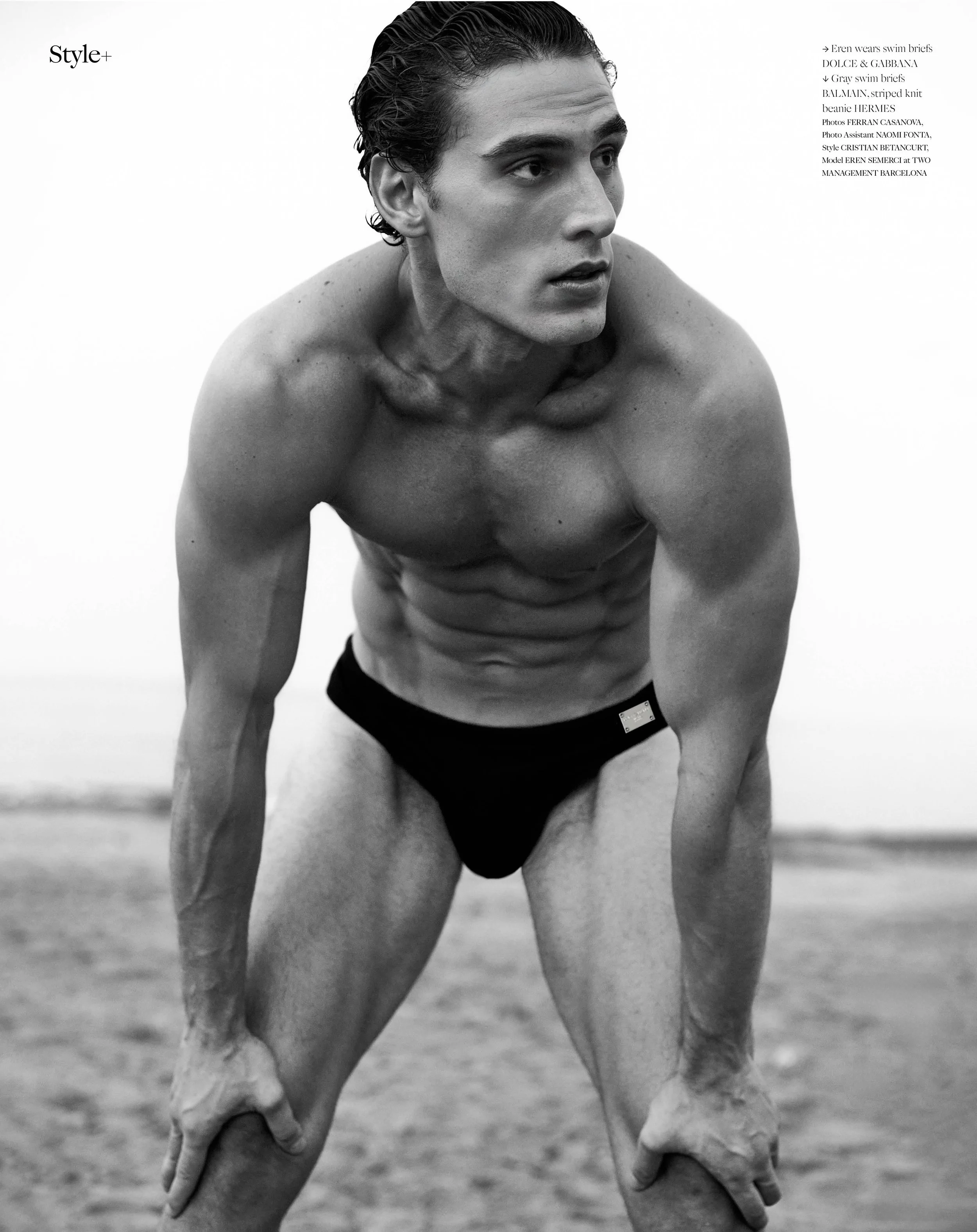 1-2. Eren Semerci wears yellow to red ombre swim briefs MOSCHINO 3-4. Gray t-shirt CALVIN KLEIN, dark gray core swim briefs PRISMA, black t-shirt CALVIN KLEIN, light gray swimvbriefs BALMAIN 5-12. Eren wears swim briefs DOLCE & GABBANA 13-14. Gray swim briefs BALMAIN, striped knit beanie HERMES